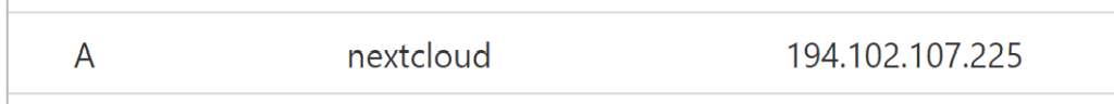 Pentru a putea folosi NextCloud cu ajutorul unui domeniu web, trebuie să ne asigurăm că în zona DNS există o înregistrare de tip A (alias) ce trimite către adresa IP a serverului. Exemplu Cloudflare: