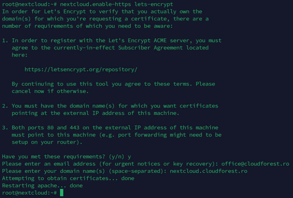 În continuare, pentru a ne putea conecta în siguranță la serverul nostru de NextCloud, va trebui să instalăm un certificat SSL gratuit Let’s Encrypt.