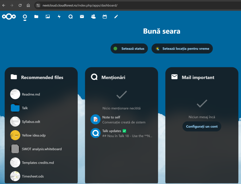 Nextcloud reprezintă o alternativă puternică și flexibilă la soluțiile comerciale de stocare în cloud, oferind utilizatorilor control deplin asupra datelor lor, securitate avansată, și funcționalități extinse pentru colaborare și productivitate. Este ideal atât pentru utilizatori individuali, cât și pentru organizații care doresc să-și păstreze datele private și securizate.